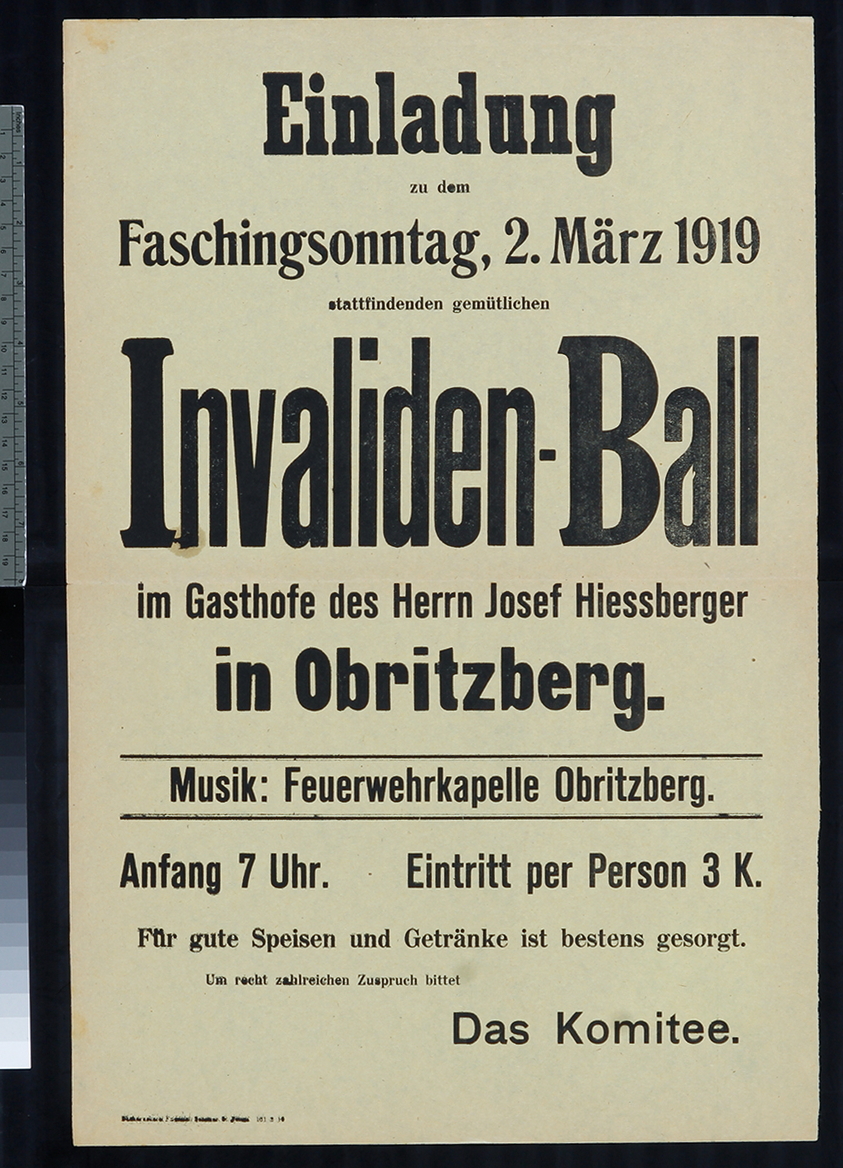 Einladung, Invalidenball Obritzberg, Gasthaus Josef Hiesberger, 2. März 1919.