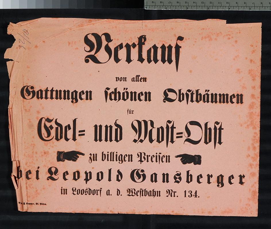 Verkauf von allen Gattungen schöner Obstbäume für Edel- und Mostobst, Loosdorf a. d. Westbahn Nr. 134, Leopold Gansberger, 1891.