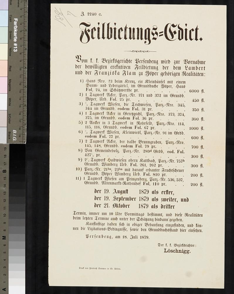 Feilbietungsedikt, Realitäten Lambert und Franziska Flam Ysper, Bezirksgerichte Persenbeug, k.k. Bezirksrichter Löschnigg, 18. Juli 1879.