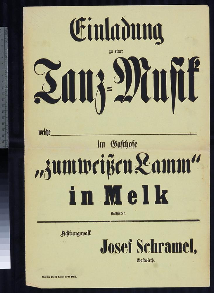 Einladung, Tanzmusik Melk, Gasthaus Josef Schramel "zum weißen Lamm", 1884.