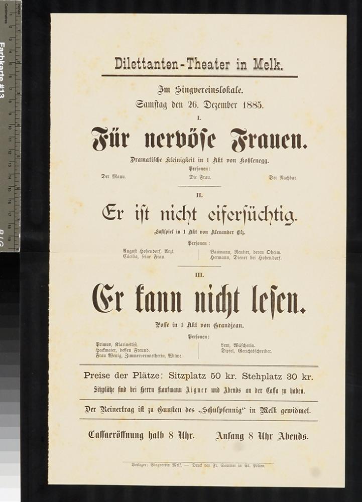 Kundmachung, Theater "Für nervöse Frauen", "Er ist nicht eifersüchtig" und "Er kann nicht lesen", Dilettantentheater Melk, 26. Dezember 1885.