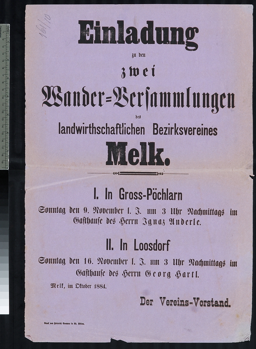 Einladung, Zwei Wanderversammlungen des landwirtschaftlichen Bezirksvereines Melk in Loosdorf und Groß Pöchlarn, 1884.