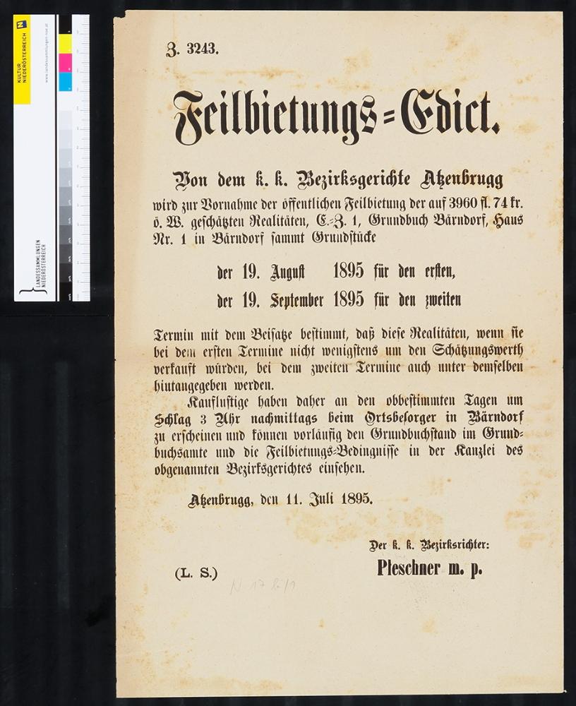 Programm, Feilbietunsedikt Realität Bärndorf Haus Nr. 1, k.k. Bezirksrichter Pleschner, 11. Juli 1895.