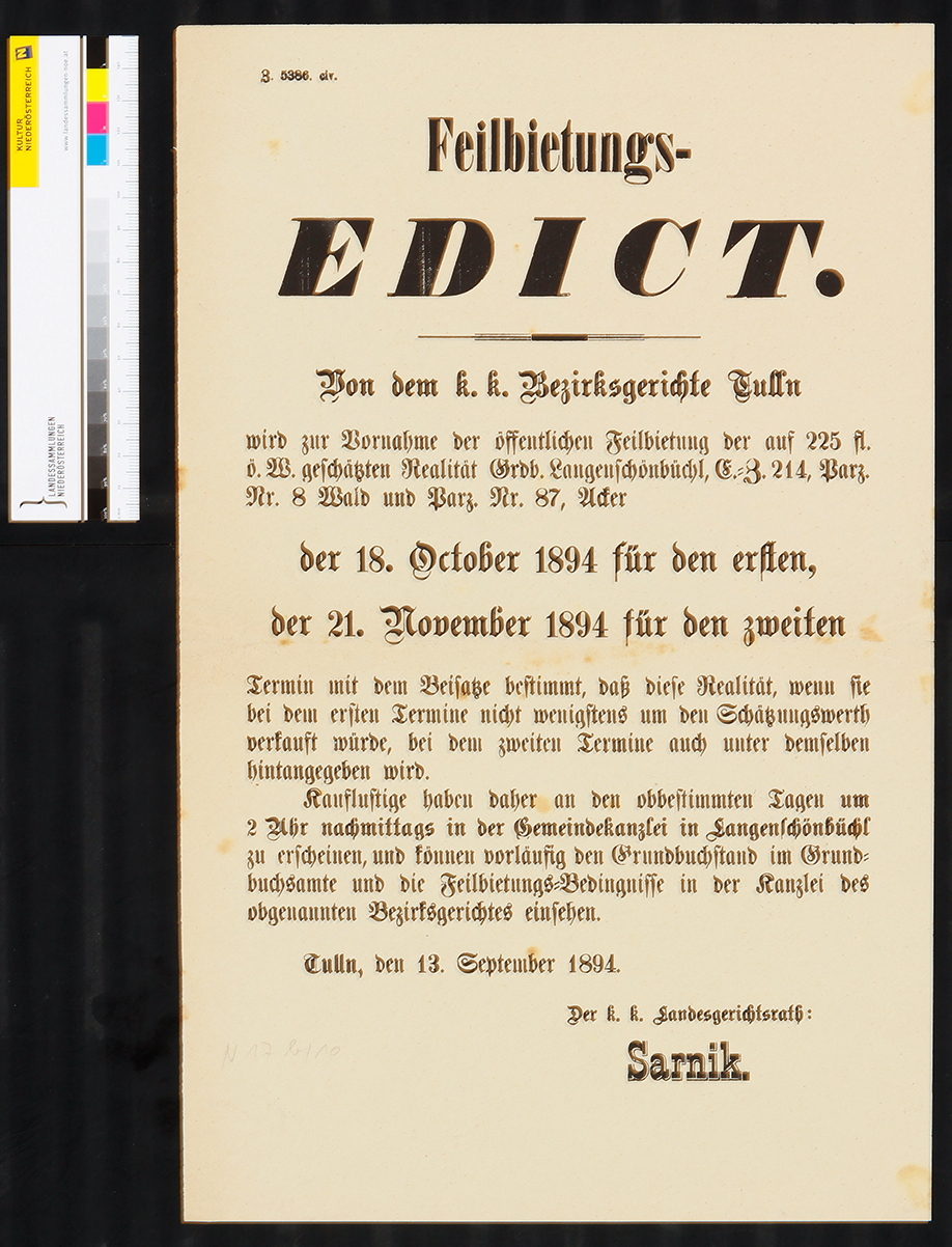 Feilbietungsedikt, Realität Langenschönbüchl, k.k. Landesrichter Sarnik, 13. September 1894.