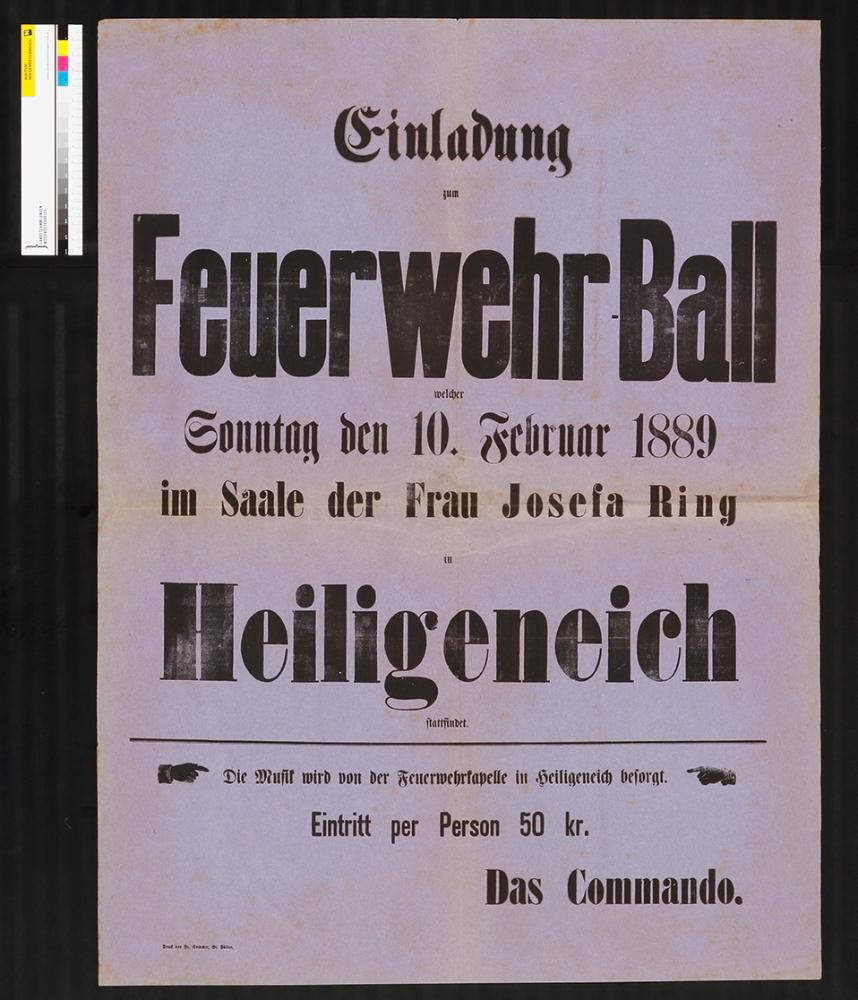 Einladung, Feuerwehrball Heiligeneich, Gasthaus Josefa Ring, 10. Februar 1889.