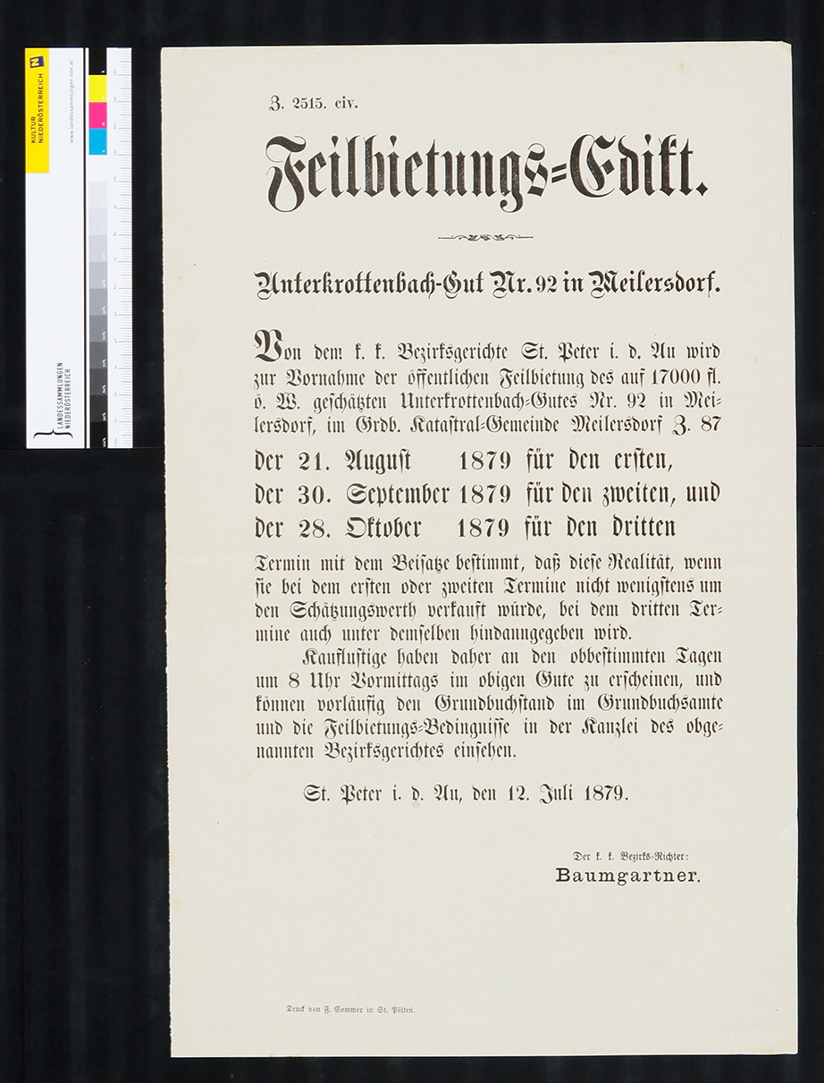 Feilbietungsedikt, Realitäten Unterkrottenbachgut Nr. 92 in Meilersdorf, k.k. Bezirksrichter Baumgartner, 12. Juli 1879.