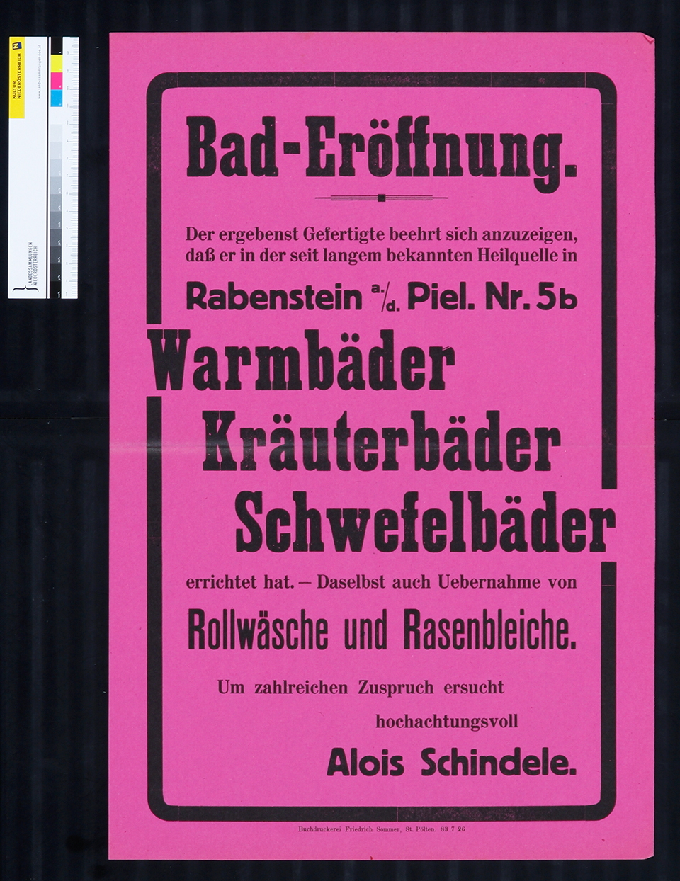 Baderöffnung, Warmbäder, Kräuterbäder, Schwefelbäder, Rabenstein an der Pielach 5b, 1926.