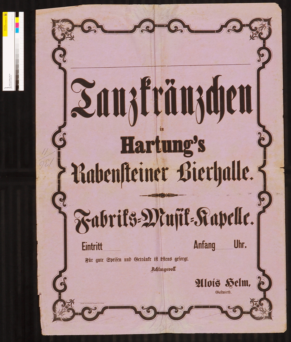 Ankündigung, Tanzkränzchen Hartung, Rabensteiner Bierhalle, Gasthaus Alois Helm, 1880.