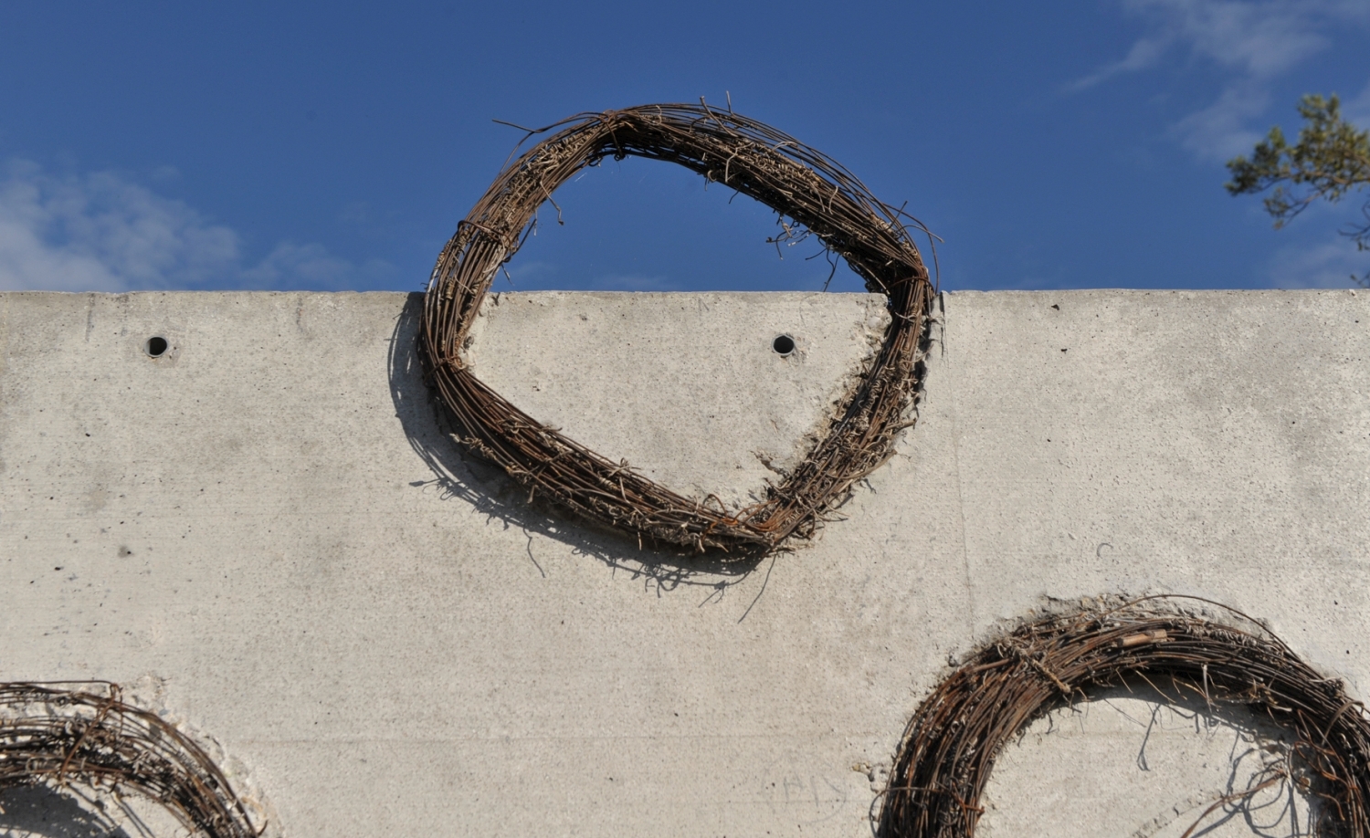 Ähnlich einem fossilen Fund bettet Wolfsberger die Drahtringe in Beton, um die Fundstücke anschaulich zu machen und das Gefühl zu vermitteln, dass so mancher Ring im Inneren verborgen ist, konserviert für die Ewigkeit. Die amorphen Drahtringe samt den organischen Stoppelzieher-artigen Weintrieben erscheinen als archäologischer Fund.
