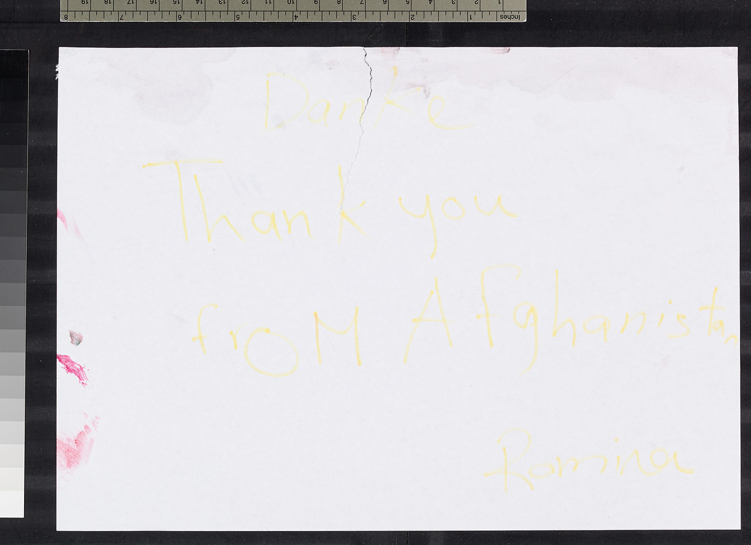 handschriftlich mit orangem Filzschreiber „Danke Thank you from Afghanistan, Romina“.