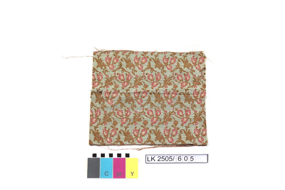 Stoffmuster in türkis, mit Blumen- und Blattmuster in braun, rosa, beige; Muster für Dekorstoff; figural ornamentiert;