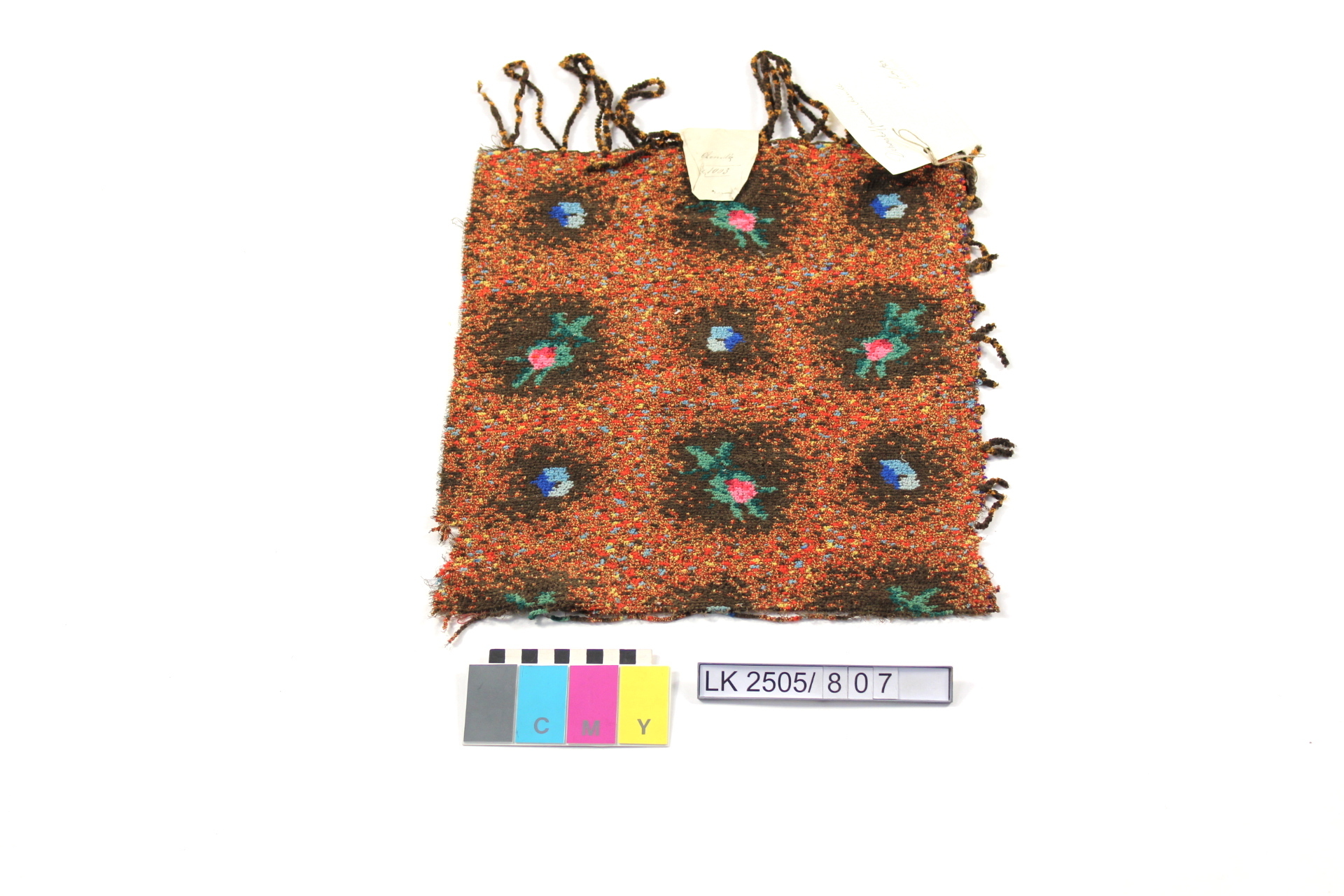 Stoffmuster aus Chenille bunt melliert, mit Blumenmedaillons in rot, rosa, blau, braun, grün, Schlaufen; Dekorstoffmuster aus Chenillegewebe;