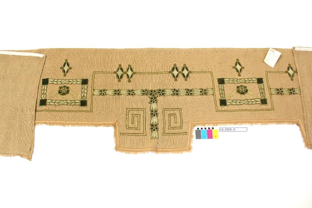 In Grüntönen, Leinenportiere, mit geometrischer und floraler Applikationsstickerei; Portiere; mit leonischer Stickerei