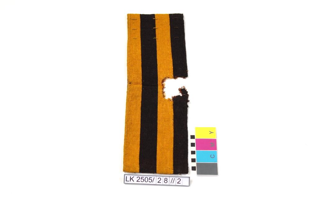 Woll-, Baumwollstoff in gelb, schwarz/braun gestreift; Stoffmusterkonvolut; schwarz gelb gestreift und tw. mit eingewobenen Ornamenten; die Stücke sind auf der Rückseite durch die Nummern "2", "5", "12" bezeichnet;
