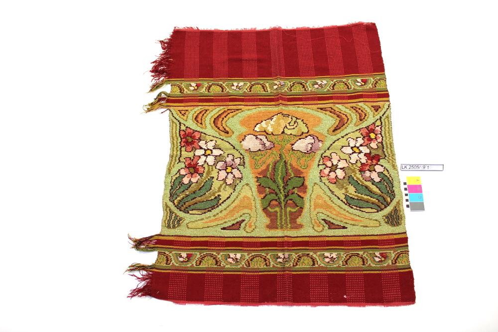 Stoffmuster dunkelrot mit breiter floraler Chenillebordüre in grün, rosa, rot, beige, lila; Stoffmuster (ev. für Vorhang); Dessing "Fauré" mit Chenillegewebe; Fransen, Blütenornamentik und Elemente des geometrisierenden Jugendstils;