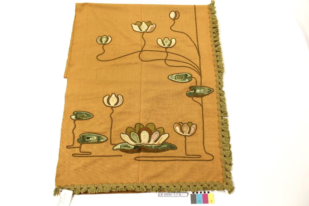 Seitenteil in hellbraun mit Schnur- und Chenillestickerei in grün, rosa, wieaa, braun, Seerosenmotiv; Vorhangseitenteil; mit Chenillefaden floral bestickt; Borte mit Quasten (leonischer Faden); floraler Jugendstil;