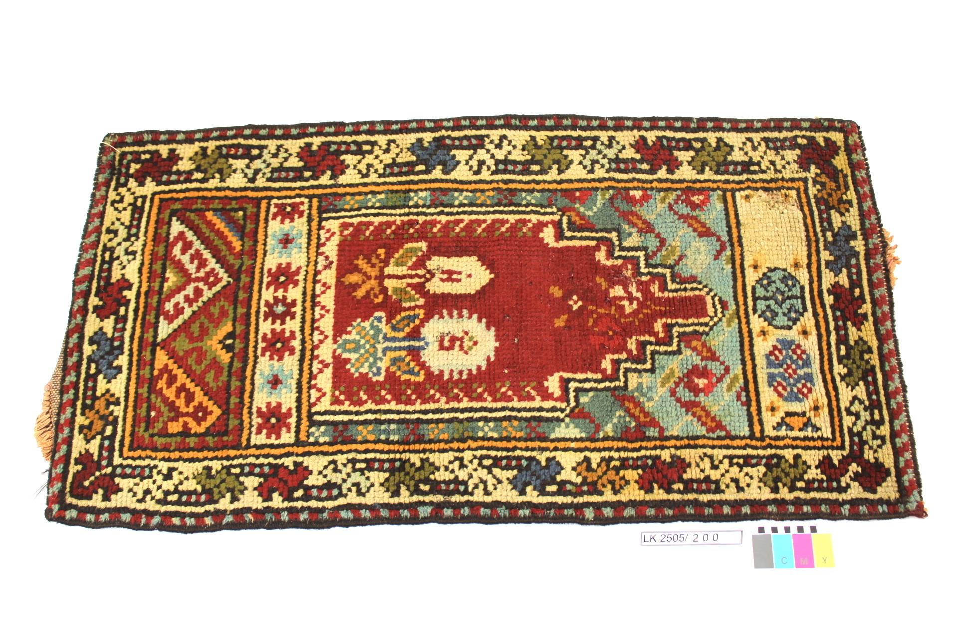 Teppich mit Gebetsnische in rot, gelb, weiss, grün, blau; Teppich; eventuell islamischer Gebetsteppich mit mihrab; Initialien "H.S."