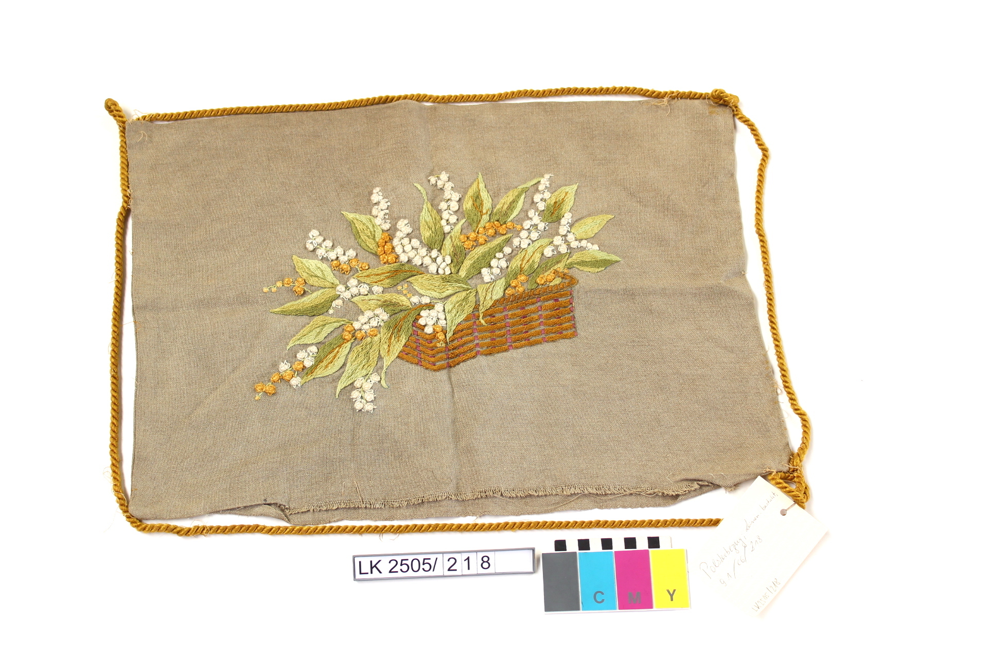 Polsterbezug in natur, bestickt mit Maiglöckchenkorb in weiß, grün, braun, gelb, gold. Gelber Keder; Polsterbezug aus Leinen; bestickt; Kordel