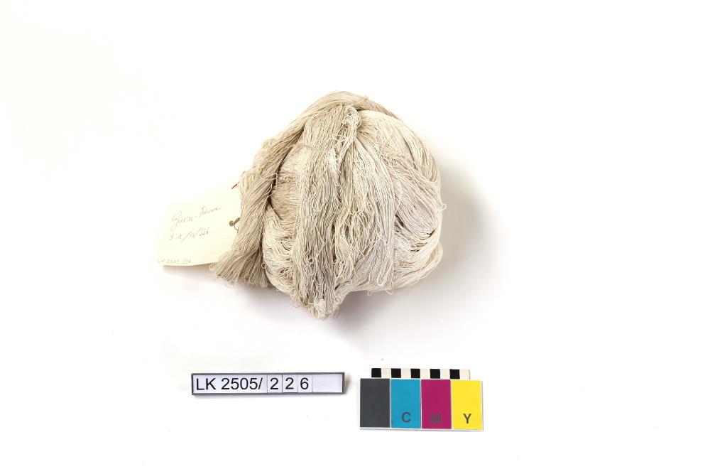Knäuel aus weißem Baumwollgarn, Rohware. Maße sind Stellmaße; Garnballen; unbehandelte Rohware