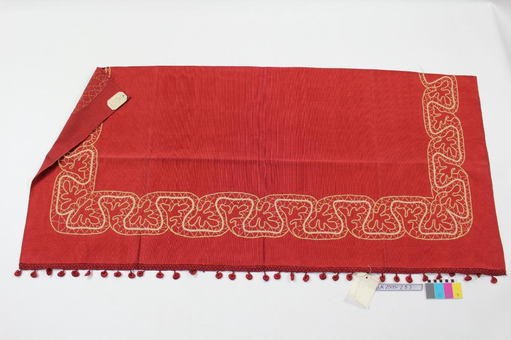 Portiere in rot - Moiré, mit Schnurstickerei mit Klöppelborte in natur, Bommelborte; Portiere; gerippt; bestickt; Bordüre mit Garnquasten; laut Anhänger "Musterschutz Hackl und Söhne"