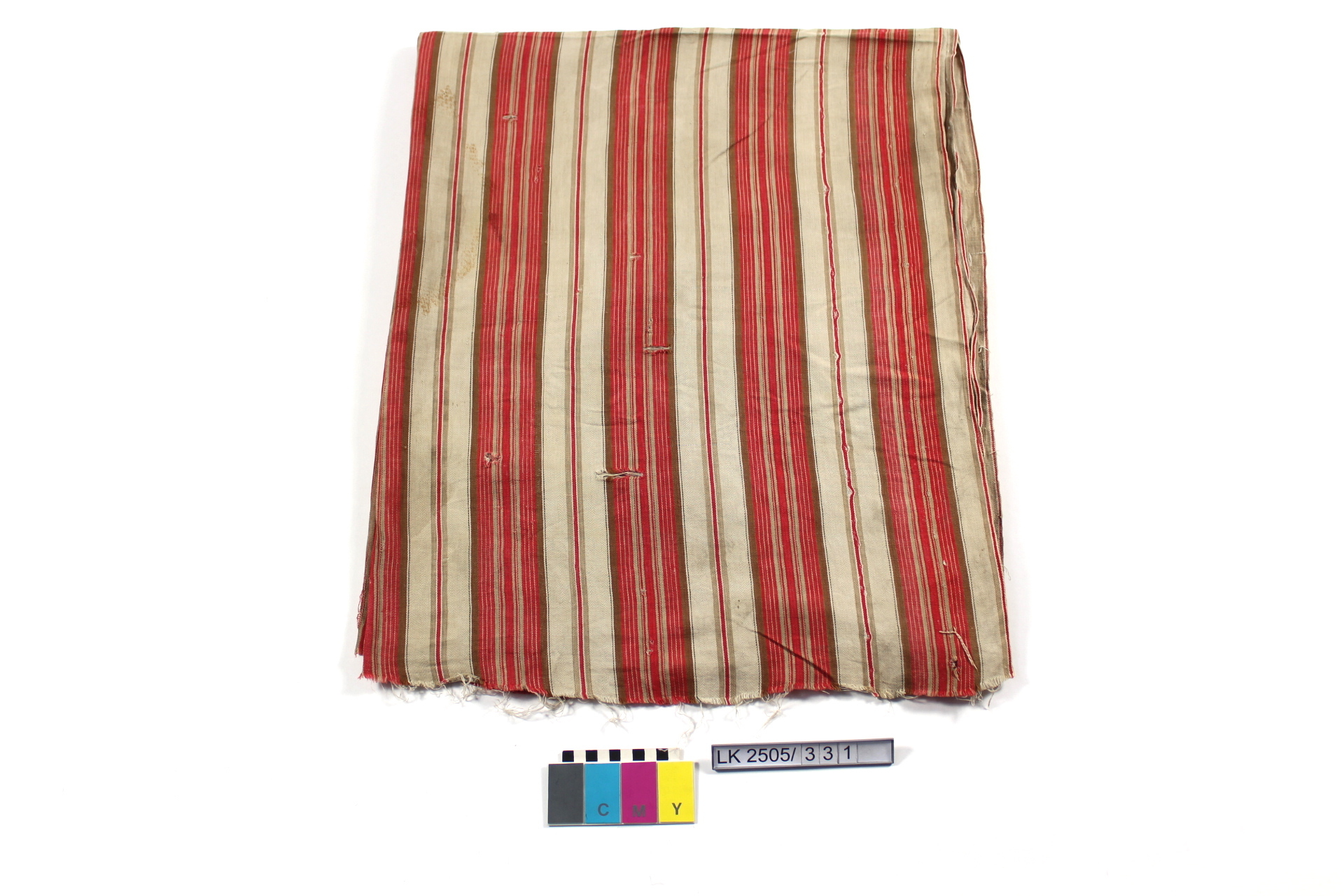 Stoffmuster längsgestreift in rot, beige, braun; Dekorstoff (Reststück);