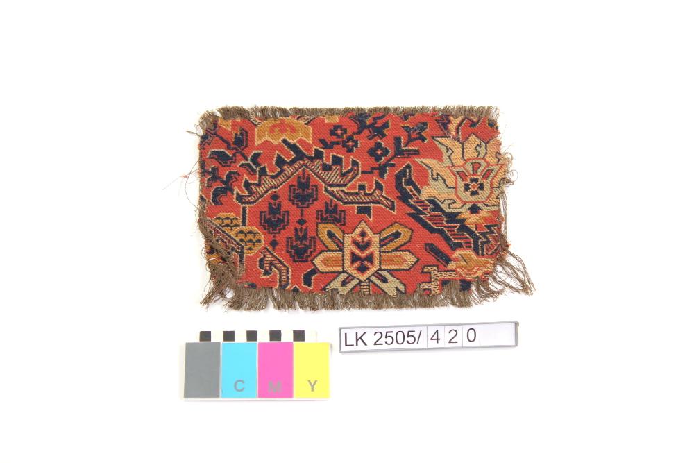 Stoffmuster in rot mit geometrischem Muster in blau gelb, beige, rot; Dekorstoffmuster; figural ornamentiert;