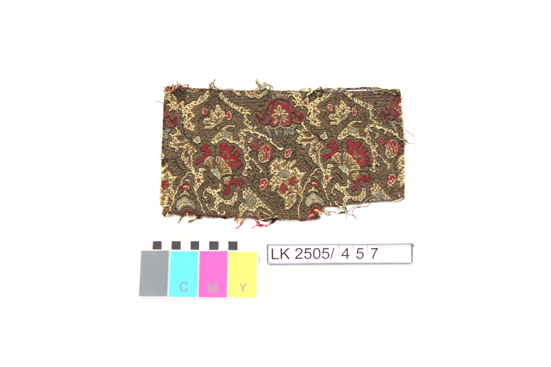 Stoffmuster in braun mit regelmäßigem Blumenmuster in beige, rot, grau; Dekorstoffmuster; figural ornamentiert;