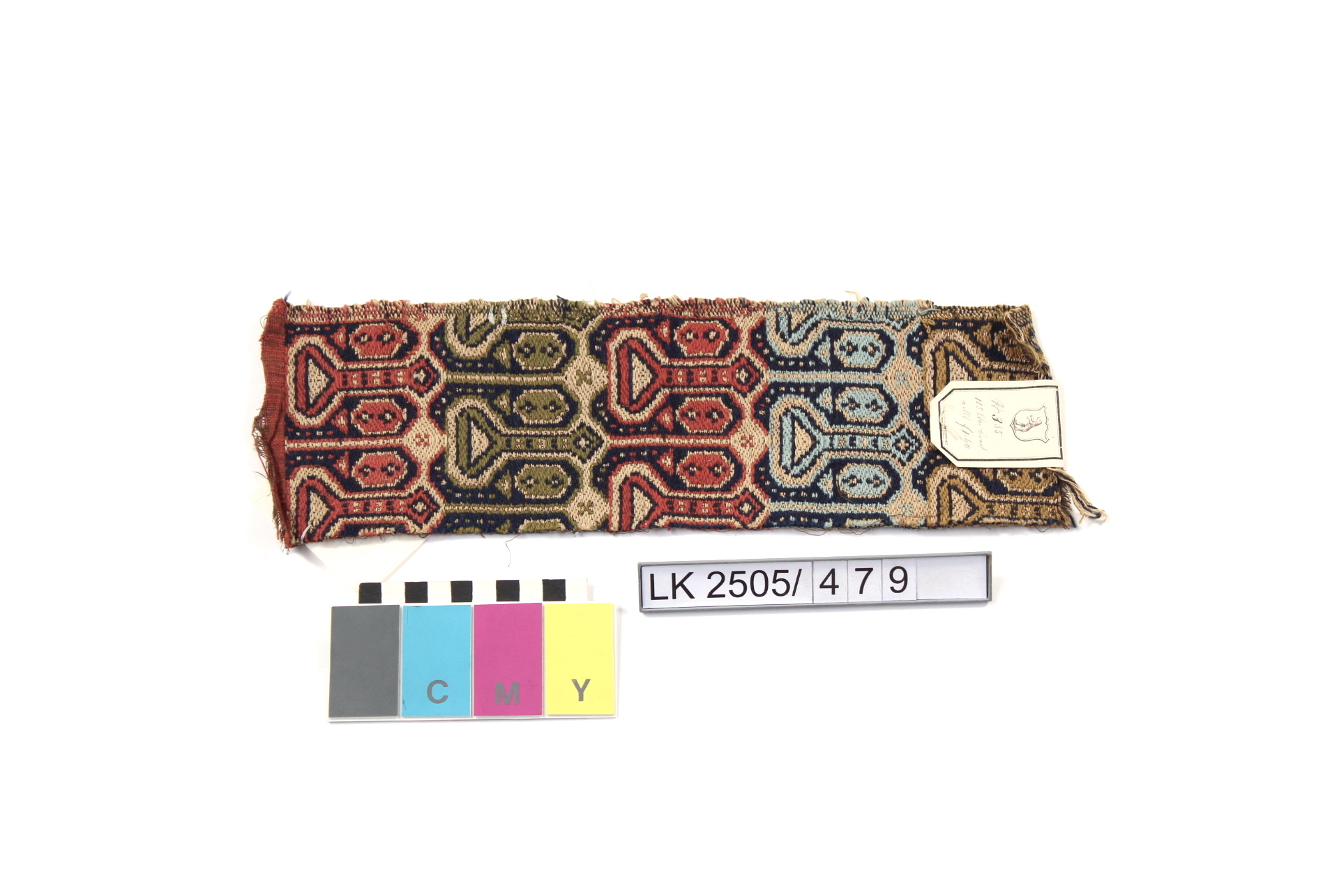 Stoffmuster in beige mit geometrischem Muster in ocker, blau, rot; Dekorstoffmuster; figural ornamentiert;