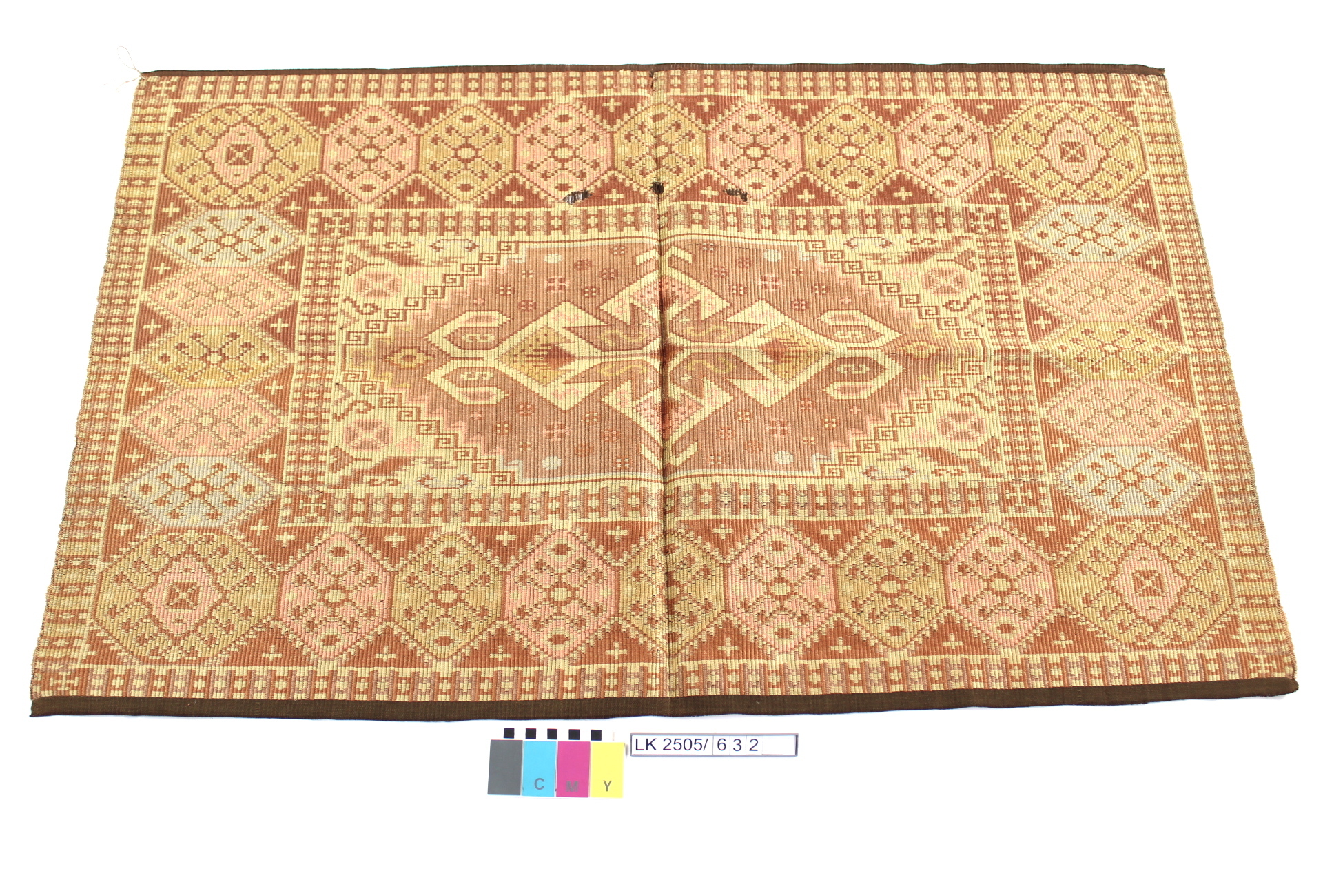 Wandbehang mit geometrischer Musterung in braun, natur, blau, rosa, gelb; Wandbehang; figural ornamentiert