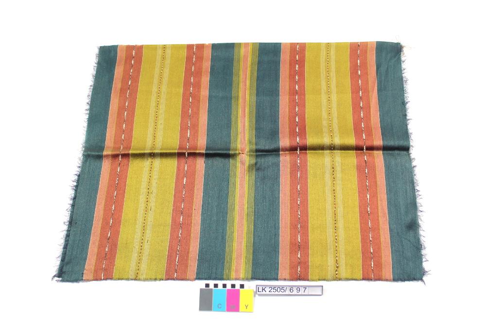 Stoffmuster quergestreift in rot, blau, grün, rosaund Chenillefäden; Portiere; aufgestickte Bordüre auf Samtgrund; unterfüttert; Garnquasten