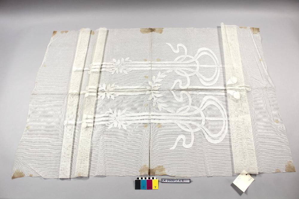Store in weiss, mit Applikationsstickerei, Jugendstilmotive mit Stäben, Schlingen und Blättern; Store; mit umstickten Applikationen