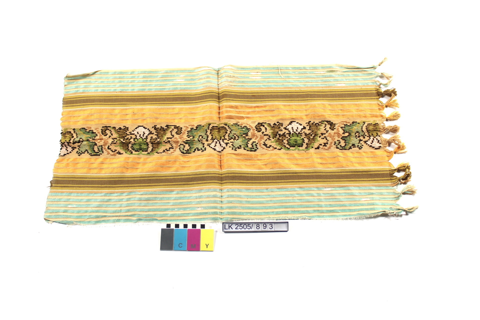 Stoffmuster quergestreift in türkis, gelb, grün mit floraler Chenillebordüre in grün, braun, beige, weiss, schwarz, Fransen; Dekorstoffmuster mit Chenille;