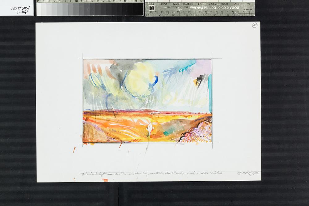 SignaturRecto, monogr. unten 1. Drittel links: "AW"; Recto, bez. unten links: "Weite Landschaft über das Wiener Becken hin, von West- oder Ostseite, so und so relativ ähnlich", dat. unten rechts: "12. Mai 77, 1.23 h"; Recto, oben rechts: "13" [in einem Kreis eing