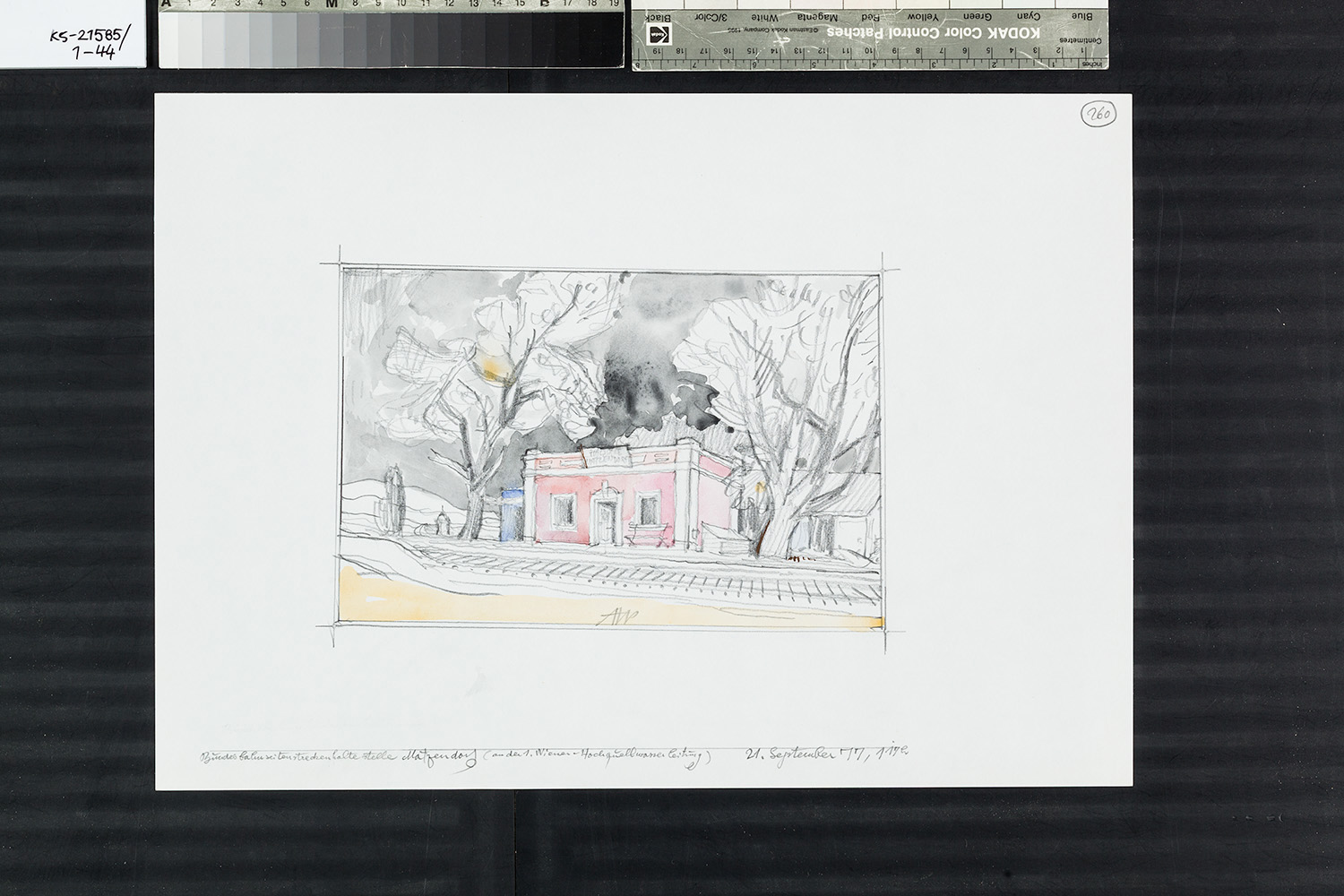 SignaturRecto, monogr. unten Mitte: "AW"; Recto, bez. unten links: "Bundesbahnseitenstreckenhaltestelle Matzendorf (an der 1. Wiener-Hochquellwasserleitung)", dat. unten rechts: "21. September 77, 1.17 h"; Recto, oben rechts: "260" [in einem Kreis eingeschrieben]