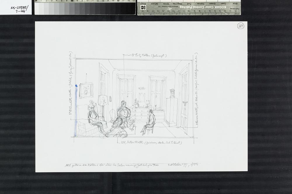 SignaturRecto, monogr. unten links: "AW"; Recto, bez. unten links: "Als gestern die Kollers bei uns im Salon waren zu Gast und zum Tee", dat. unten rechts: "3. Oktober 77, 1.54 h"; Recto, oben rechts: "269" [in einem Kreis eingeschrieben]; Recto [Beschriftungen i