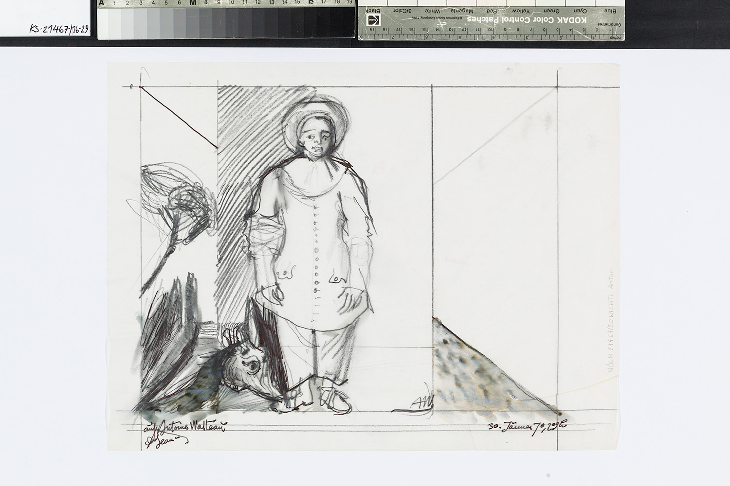 SignaturRecto, monogr. unteres zweites Drittel rechts: "AW"; Recto, bez. unten links: "auf Jean-Antoine Watteau", dat. unten rechts: "30. Jänner 70, 2.09 h"