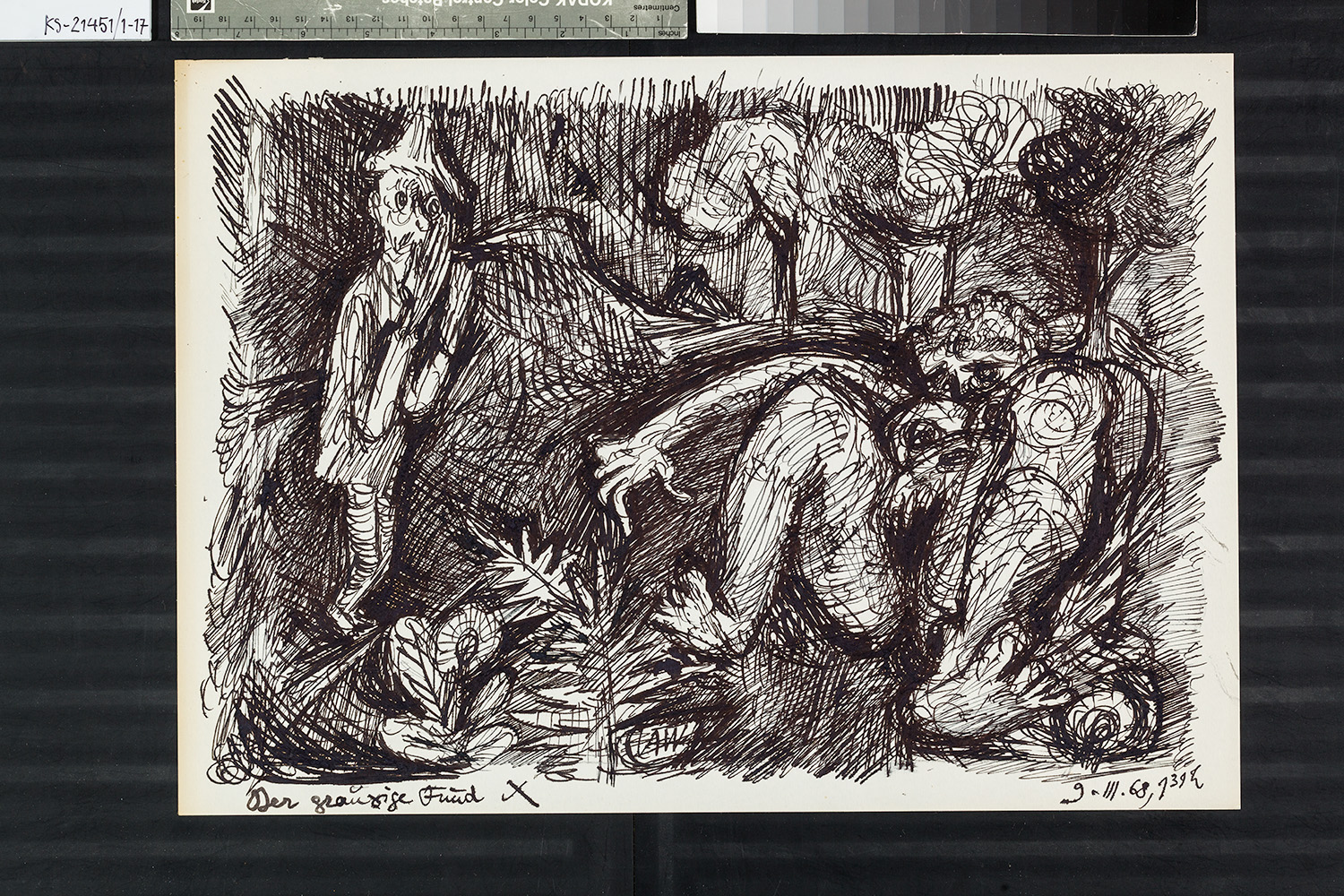 SignaturRecto, monogr. unten mittig: "AW"; Recto, bez. unten links: "Der grausige Fund X", dat. unten rechts: "9.III.68, 1.31 h"