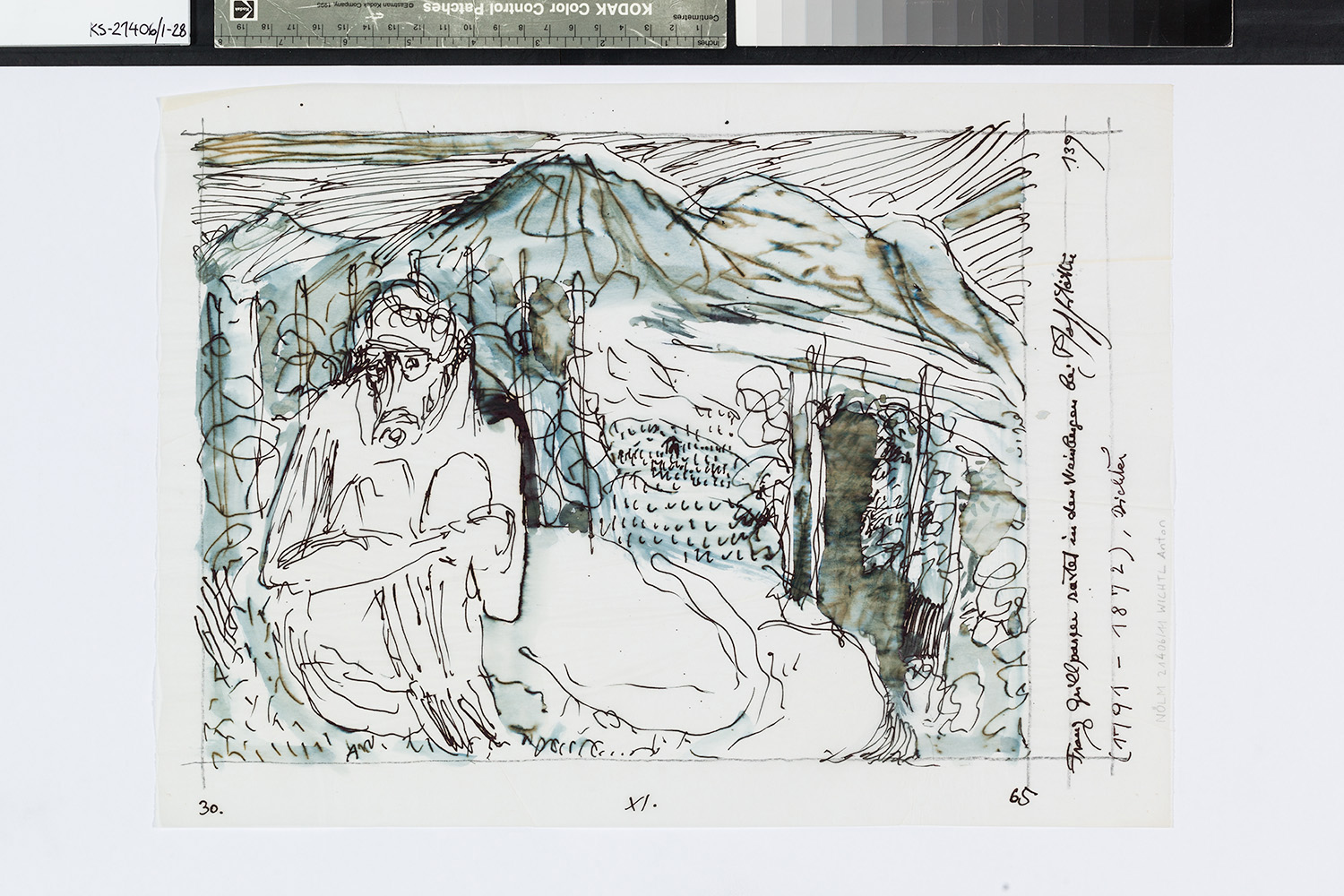 SignaturRecto, monogr. unten links: "AW"; Recto, dat. unten: "30.XI.65"; Recto, bez. rechts senkrecht: "Franz Grillparzer rastet in den Weinbergen bei Pfaffstätten (1791-1872), Dichter 139"