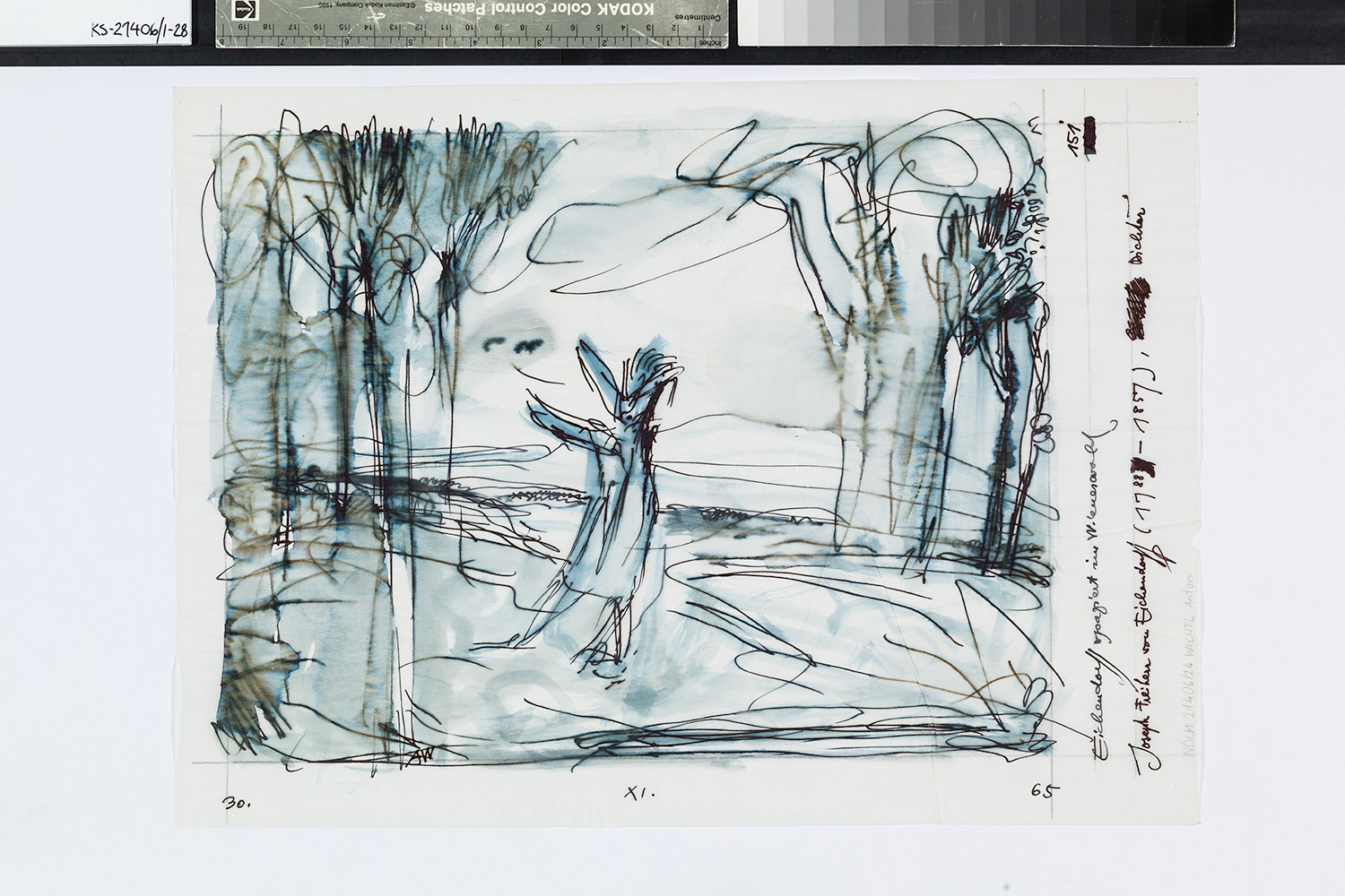 SignaturRecto, monogr. unten links: "AW"; Recto, dat. unten: "30.XI.65"; Recto, bez. rechts senkrecht: "Eichendorff spaziert im Wienerwald Joseph Freiherr von Eichendorff (1788-1857), Dichter 151"