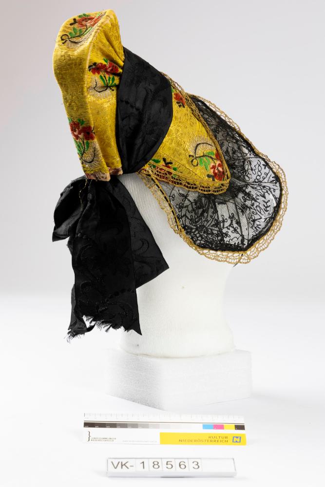 Kleine Goldhaube (Saurüsselhaube) mit schwarzer Tüllspitze und schwarzen Bändern.