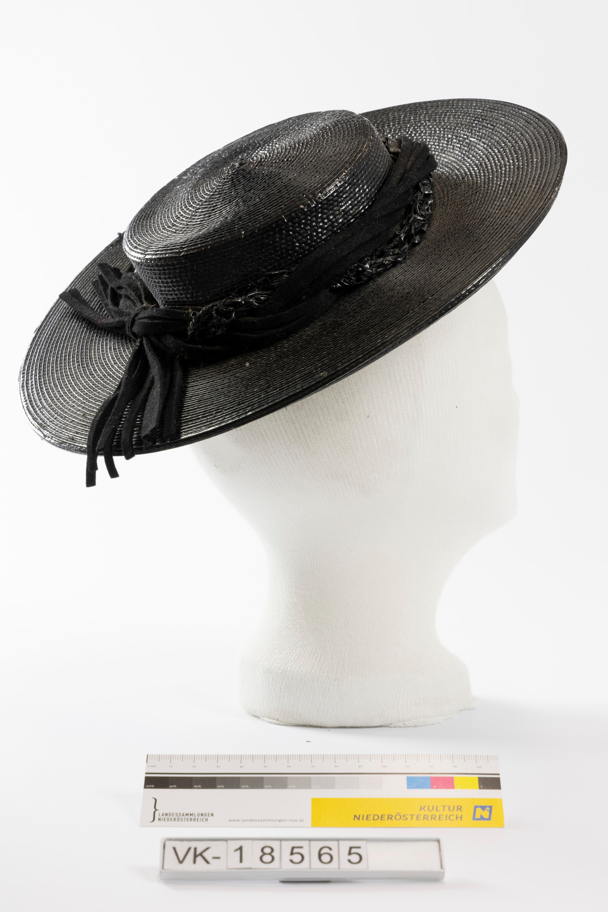 Flacher schwarzer Strohhut mit breiter Krempe.