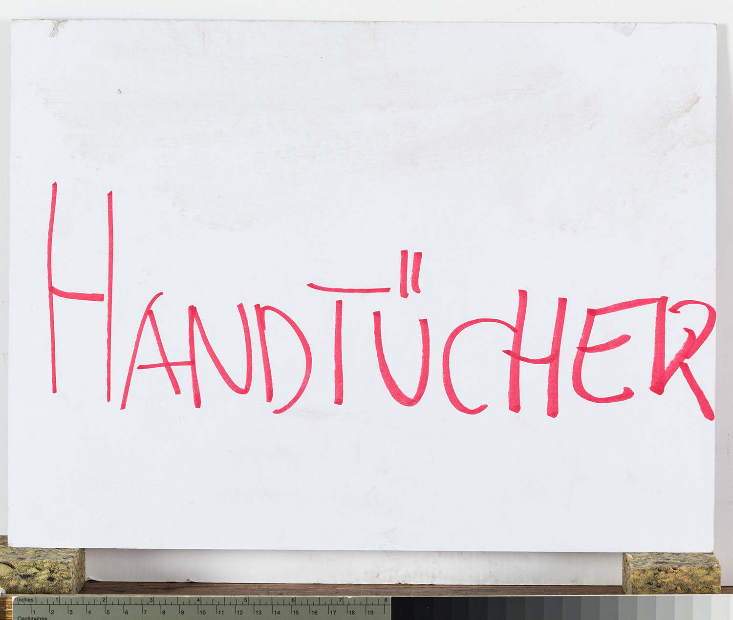 Schild „Handtücher“ (roter Faserstift), auf der Rückseite Bipa-Werbeaufdruck für Kosmetika