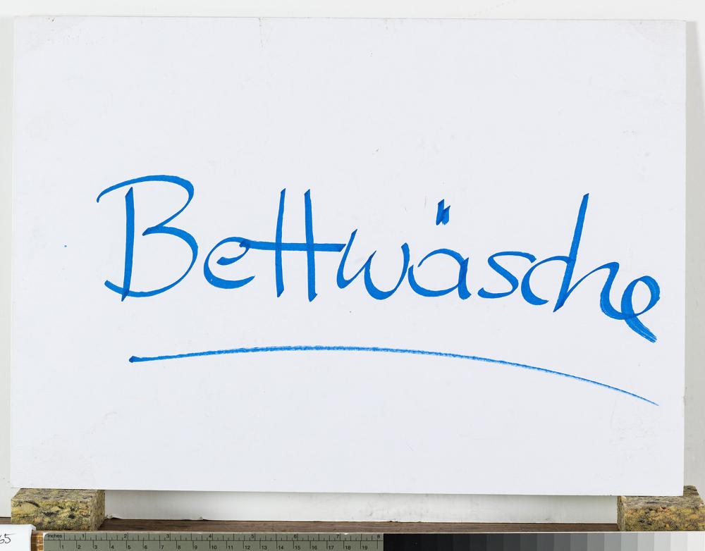 „Bettwäsche“, handschriftlich; hergestellt aus einer Werbetafel (Rückseite bedruckt)
