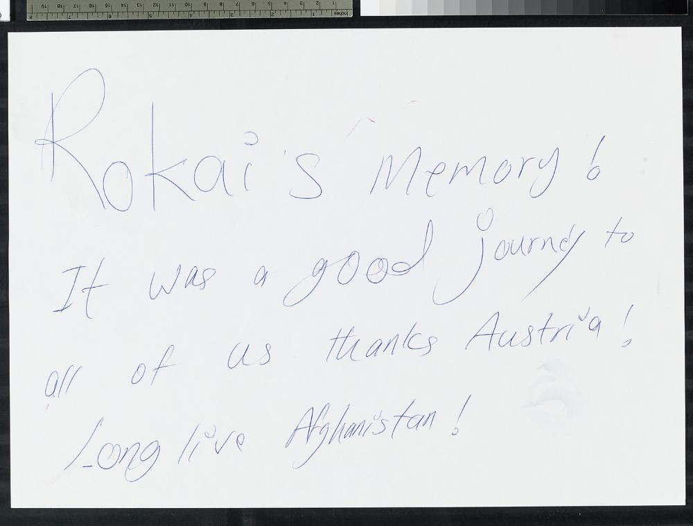 handschriftlicher Text mit Kugelschreiber „Rokai'smemory! It was a good journey to all of us thank you Austria! Long live Afghanistan!“