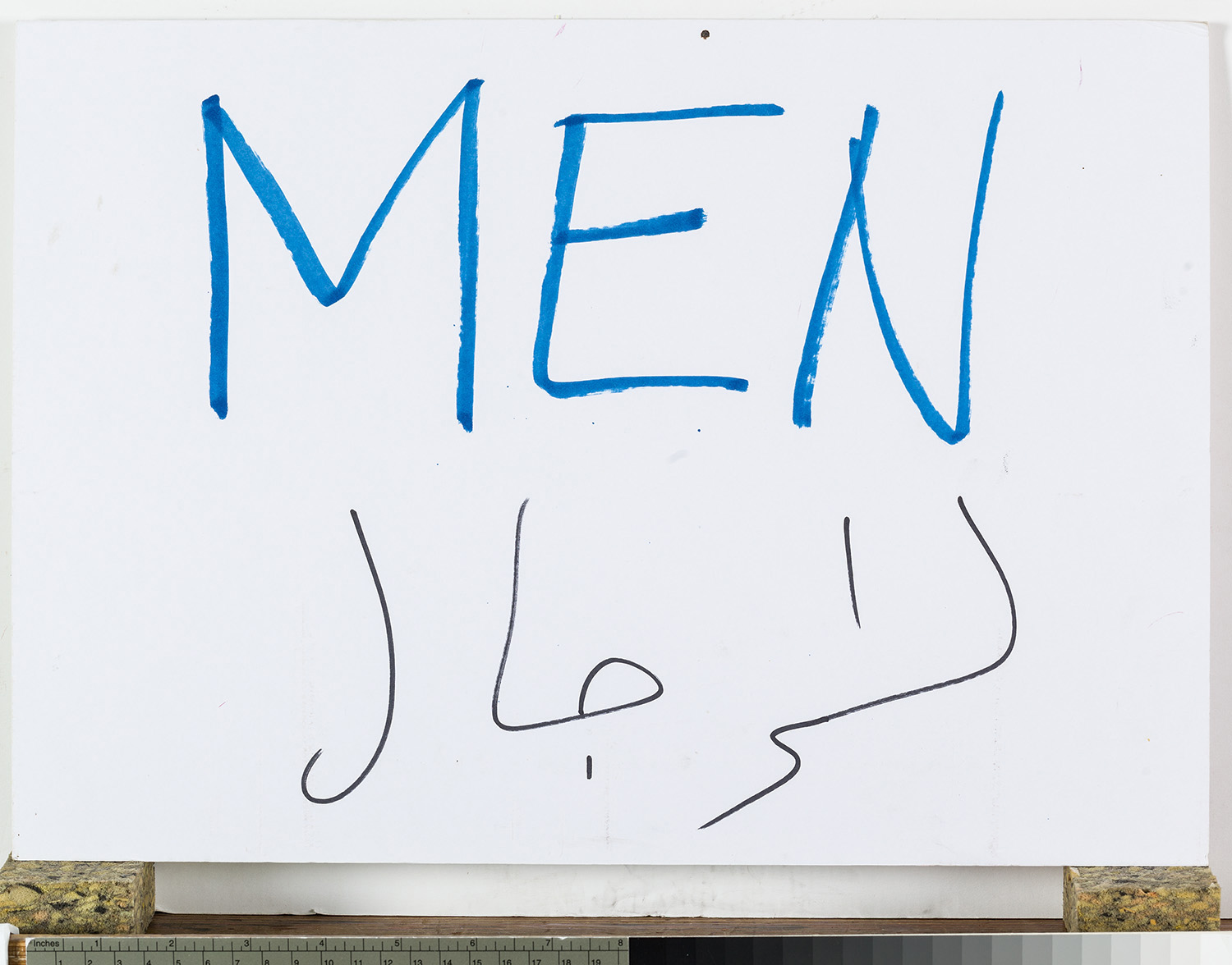 „MEN“, darunter in Arabisch/Farsi, handschriftlich, hergestellt aus einer Werbetafel (Rückseite bedruckt)