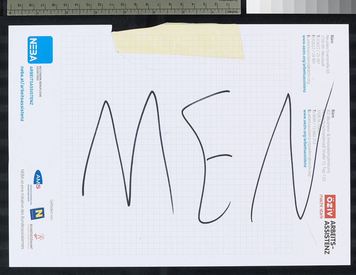 „MEN“, handschriftlich auf einem Zettel von einem Block der Firma NEBA/ÖZIV (Arbeitsassistenz)