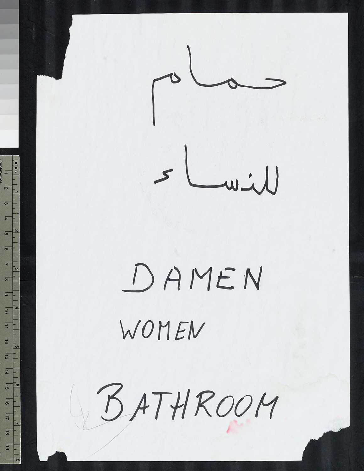 Arabisch/Farsi, darunter „Damen Women Bathroom“, handschriftlich
