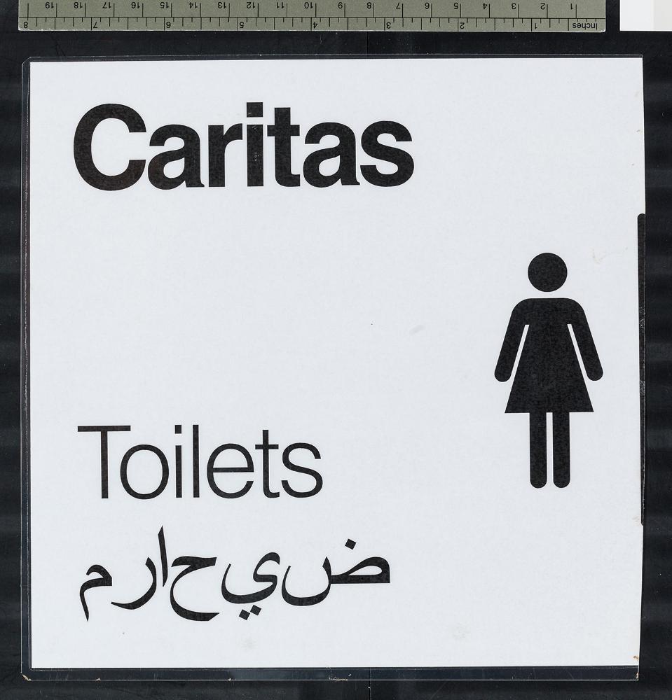 links oben Logo Caritas, darunter „Toilets“ sowie auf Arabisch/Farsi, daneben Piktogramm für Frau