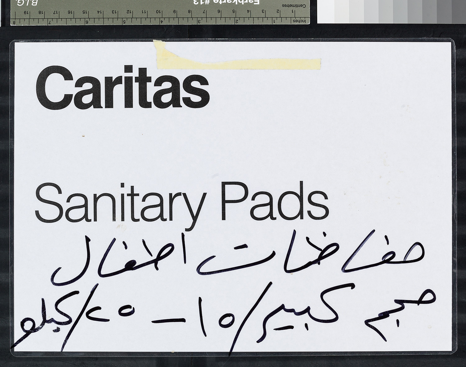Caritas Logo, „Sanitary Pads“ darunter handschriftlich in Arabisch/Farsi
