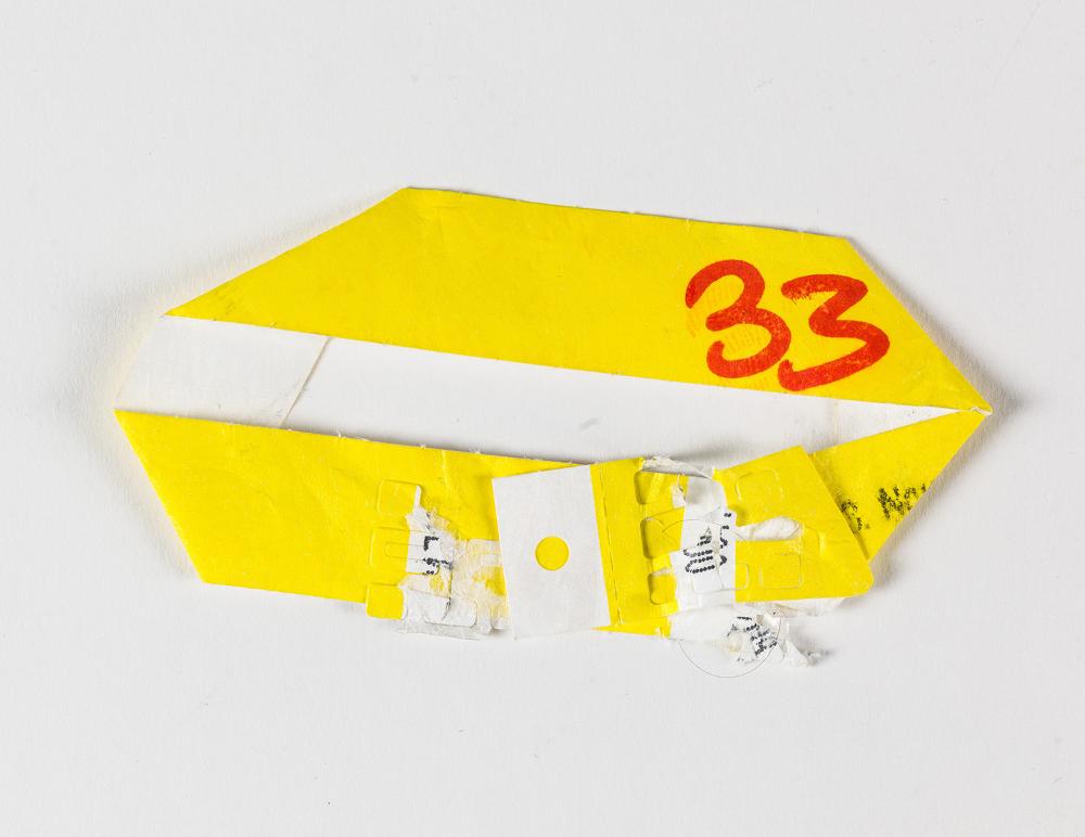 Gelbes Armband mit handschriftlicher Nr. 33 für die Notschlafstelle der ÖBB im ehemaligen Verwaltungsgebäude „Blaues Haus“. Die leerstehenden Büros in den Stockwerken 1 & 3 wurden zu Notschlafstellen umfunktioniert. Die Schlafbereiche wurden in unterschiedliche Farben eingeteilt. Hierzu wurden farbige Armbänder verteilt, damit eine einfache Zurordnung und Auffindbarkeit des zugewiesenen Schlafplatzes möglich war. Kapazität: ca. 500 Betten.